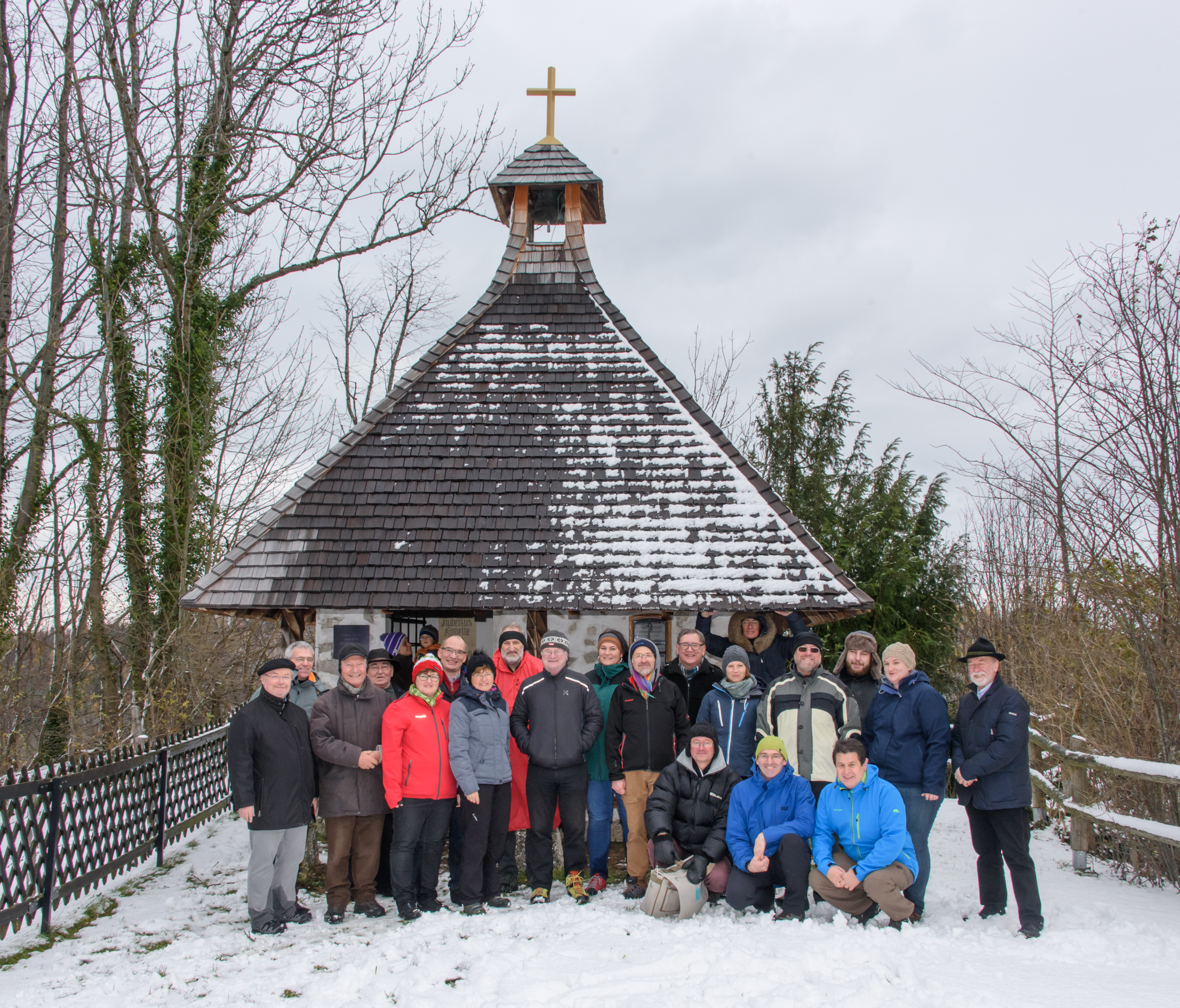Der guten Stimmung der Wanderfreudigen konnten die Wetterkapriolen jedoch keinen Abbruch tun. Etwa eineinhalb Stunden war die Gruppe in der winterlichen Landschaft unterwegs und genoss die frische Schneeluft. „Wir sind einen der vielen Wege auf den Schoberstein gegangen – nicht ganz hinauf, aber bis auf etwa 1.000 Meter. Während des Gehens hat sich der Schneesturm gelegt und wir hatten von oben einen wunderschönen Blick auf Ternberg. Alle waren begeistert von der Wanderung“, freut sich Dechant Mag. Friedrich Lenhart, der die Wanderung geplant und organisiert hat. Bei der Hubertuskapelle feierte die Gruppe das Mittagsgebet, ebenfalls gestaltet von Dechant Lenhart. Danach ging es zum Aufwärmen und zur wohlverdienten Stärkung in „Mitterhumer’s Mostheurigen“. Denn schon am Nachmittag folgte der nächste Programmpunkt der Visitation – diesmal aber in warmen Räumlichkeiten und in trockenen Kleidern.